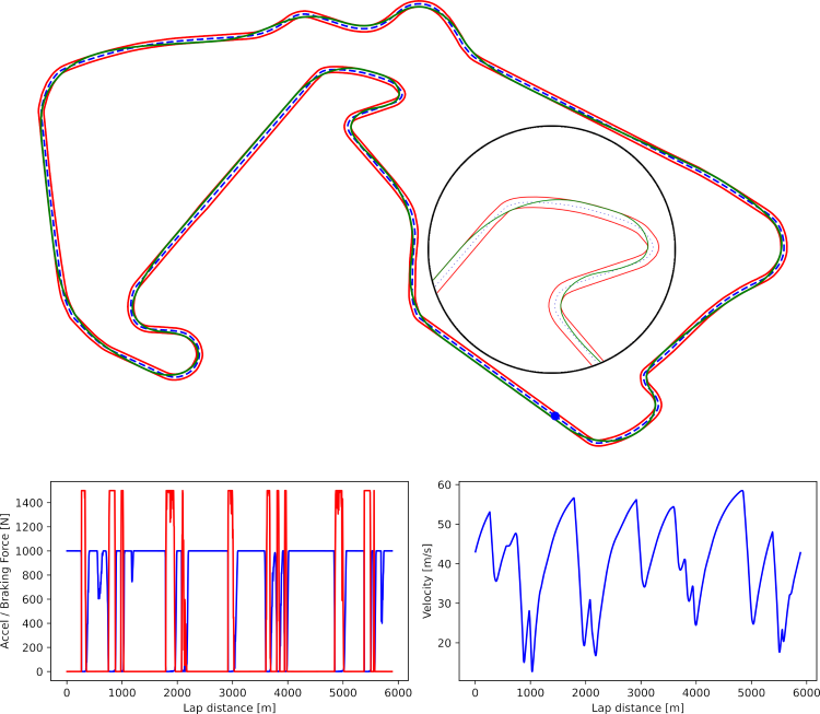 The parameter space is defined by 8*N variables which are all subject to optimization. The optimization objective is described by a scalar cost function (with the lap time as the primary objective with optional secondary objectives added to achieve smooth actuator inputs). All variables are subject to box constraints and in addition the optimization is subject to 9*N (non)linear constraints: