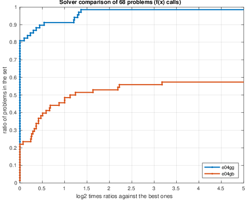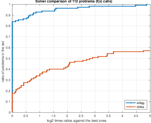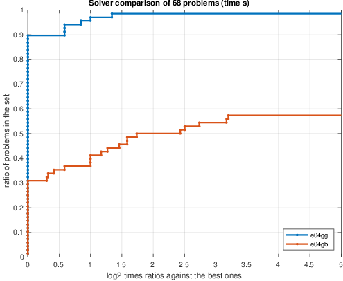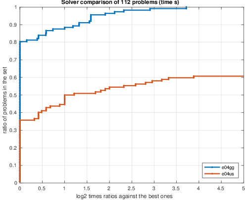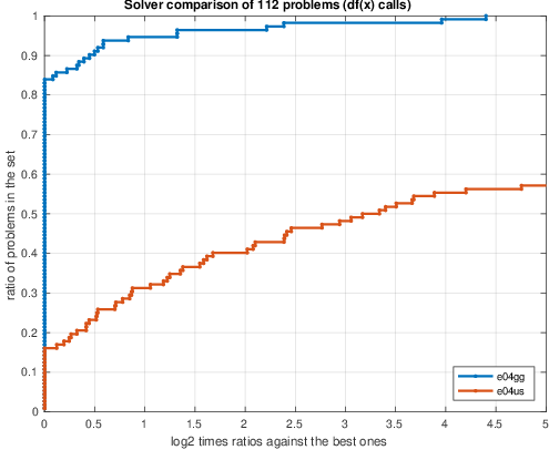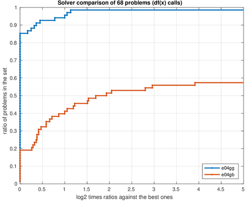 Our benchmarks comparing e04gg to e04gb on 68 unconstrained nonlinear least squares CUTEst problems are reported in Figure 1 (a)–(c) using performance profiles. The three plots show that the new solver is faster: solving 60% of the problems in less time (a) and is more robust, solving 25% more problems. Requires fewer user callbacks: 55% of problems require fewer function calls (b) and 65% require fewer gradient evaluations (c).