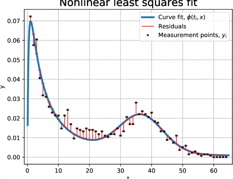 Calibrating the parameters of complex numerical models to fit real-world observations is one of the most common problems found in industries such as finance, physics, simulations, engineering, etc. nAG introduces at Mark 27.1 of the nAG Library a novel nonlinear least squares (NLN-LSQ) trust-region solver handle_solve_bxnl (e04gg) for unconstrained and bound-constrained fitting problems which implements various algorithms and regularization techniques. It is aimed at small to medium-sized fitting problems (up to 1000s of parameters) of the form