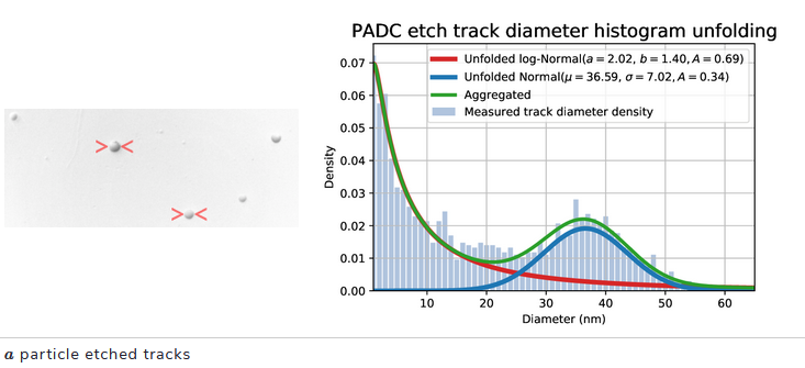 Figure 2: Left: example of a PADC target with \(a\) particle etched tracks, wedges in red show the track diameter. Right: diameter histogram from experimental data (blue bars), aggregated model used for the fitting (green curve) and unfolded models (blue and red curves). Optimal parameter values are reported in the legend.
