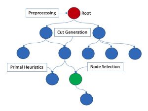 In order to solve (1) efficiently, the branch-and-bound algorithm serves as a fundamental framework, which is equipped with modern MILP techniques such as preprocessing, cut generation and various heuristics. A portion of a branch-and-bound tree is depicted in Figure 1. Starting from the original problem, noted as root node, the algorithm generates various child nodes by shaping the feasible region via adding more constraints, such as Gomory fractional cut. Each node is solved as a continuous linear programming by an efficient dual simplex method. Various heuristics are adopted to get a better lower bound. By successfully pruning the search tree and selecting the search nodes, it greatly increases the chance for a branch-and-bound algorithm to find the optimal solution in a reasonable time. See [3] for more details on algorithms to solve MILP.