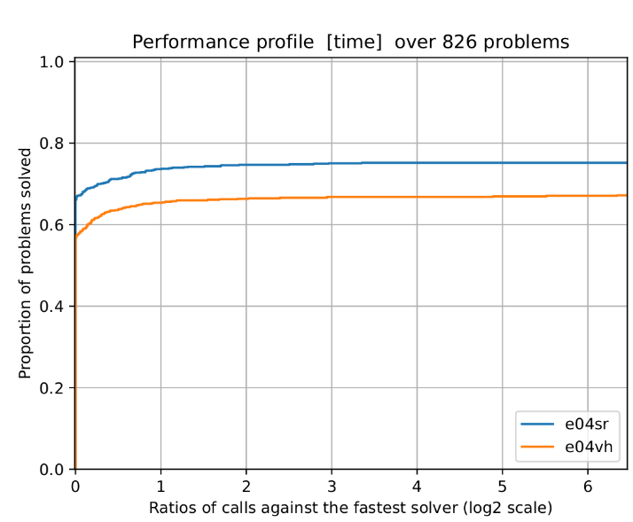 Performance and stability improvements – Benchmark studies on 826 NLP (CUTEst) problems show that the new handle_solve_ssqp (e04sr) is faster than the solver it replaces nlp2_sparse_solve (e04vh) in at least 10% of problems. It also revealed that e04sr is more robust that e04vh, solving 6.7% more problems. Specifically, it reveals that it is 25% faster in 13% of the problems and twice as fast on 5.7% of the problems. For the hardest 10% of the problems, e04sr is 1.25 times faster in 33% of those.