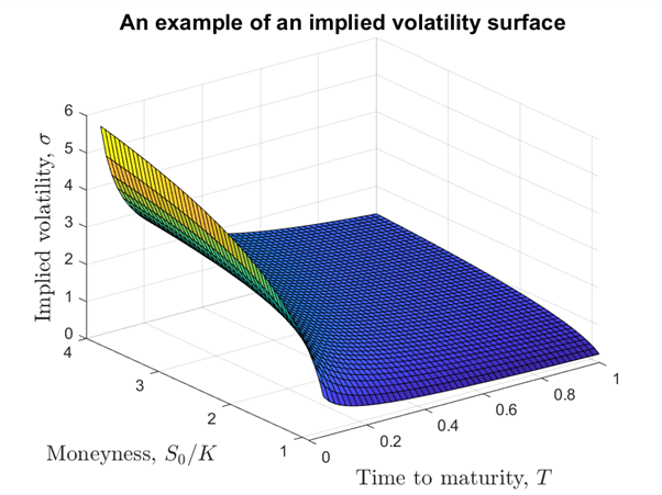 As shown in the figure, the volatility surface (a three-dimensional plot of how the volatility varies according to the price and time to maturity) can be highly curved. This makes accurately computing the volatility a difficult problem.