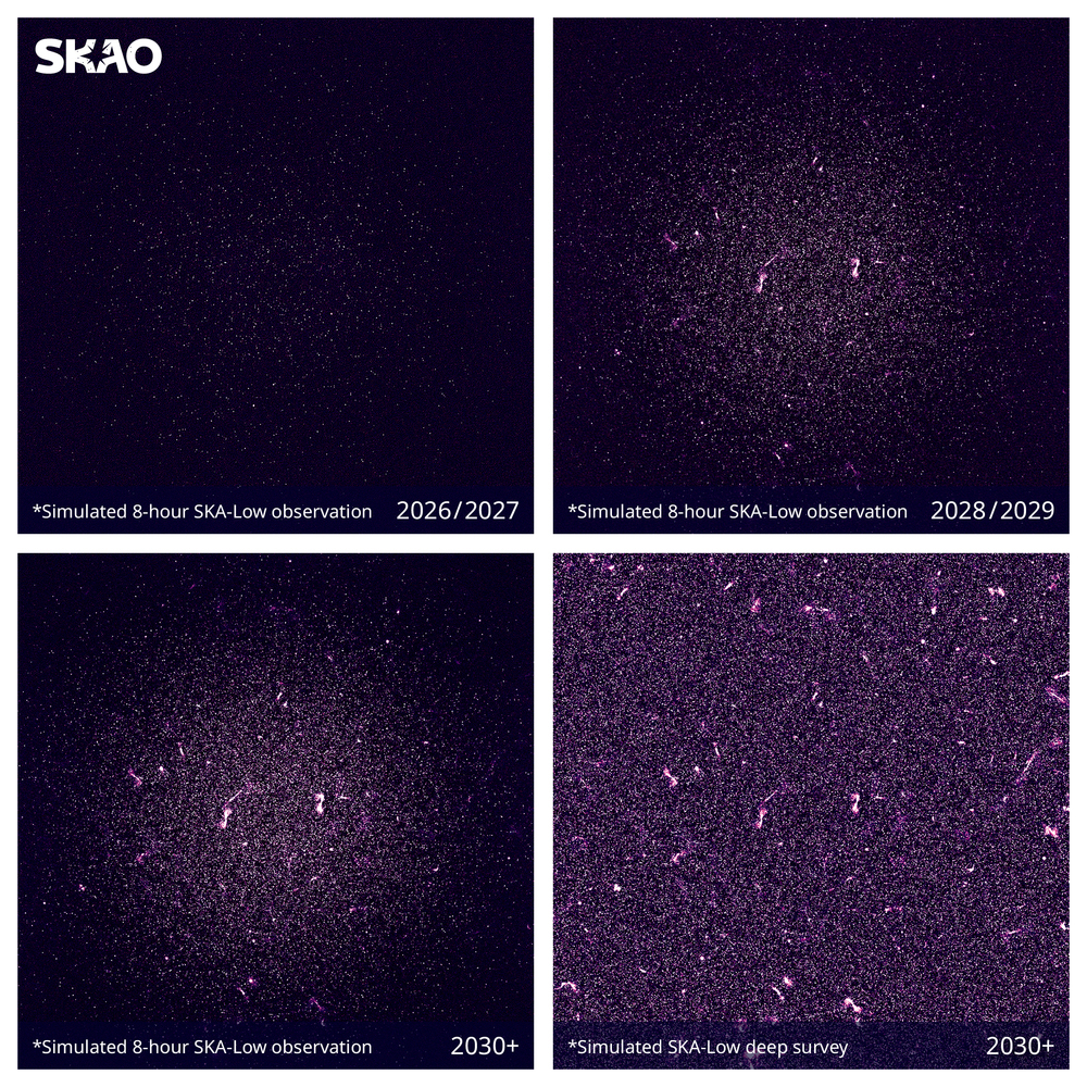 Image Copyright: SKAO · Collage of simulated images of future SKA-Low observations, showing what the telescope is expected to be able to produce as it grows in size. The images depict the same area of sky as that observed in the first image from a working version of the telescope, released in March 2025. Top left: By 2026/2027, SKA-Low will have more than 17,000 antennas and will become the most sensitive radio telescope of its kind in the world. It will be able to detect over 4,500 galaxies in this same patch of sky. Top right: By 2028/2029, SKA-Low will count over 78,000 antennas and be able to detect more than 23,000 galaxies in this field. Bottom: The full SKA-Low telescope will count more than 130,000 antennas spread over 74 km. Similar observations of this area will be able to detect some 43,000 galaxies, while deep surveys performed of this area of the sky from 2030 will be able to reveal up to 600,000 galaxies.