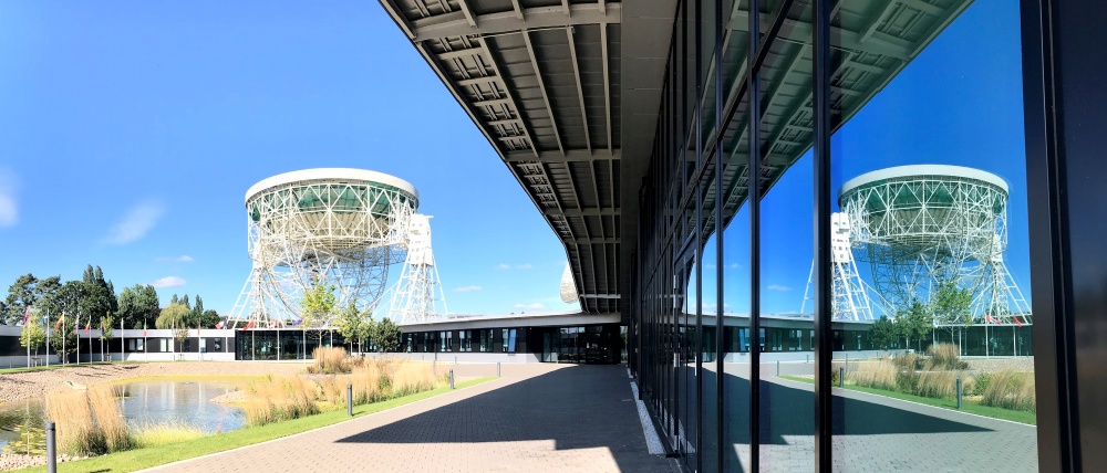 The historic Lovell Telescope reflected in the window of SKAO Global HQ, UK.
